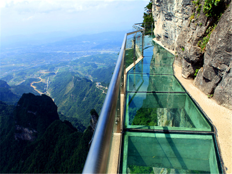 羅田天堂寨景區(qū)地處大別山主峰所在地,因其雄、奇、險、秀,獨特的山岳風光聞名于世。棧道建設(shè)歷時一年,棧道寬1.8米,全長70米,路面采用 三層鋼化夾膠防彈玻璃,每平方可承重600公斤。此處地勢險要,上下臨空,視野開闊,上看一線天瀑布、哲人峰、下俯天堂大峽谷,猴谷,吊橋河村落,位于海 潑1080米小華山一線天懸空崖壁處。